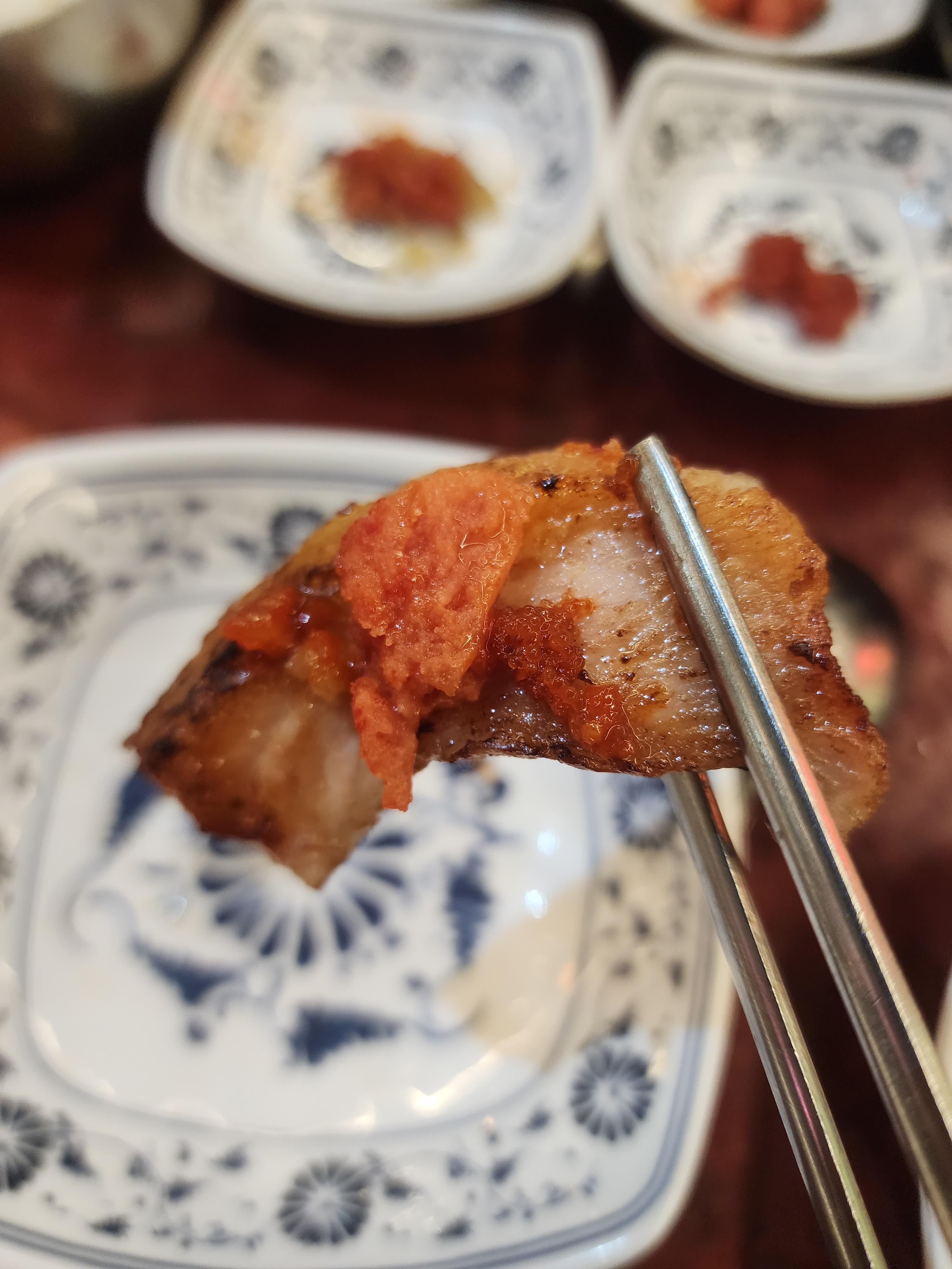 명란이 참기름과 섞여 있어서 짭짤하고 고소한 맛이 나는데 고기와 굉장히 잘 어울렸습니다.
