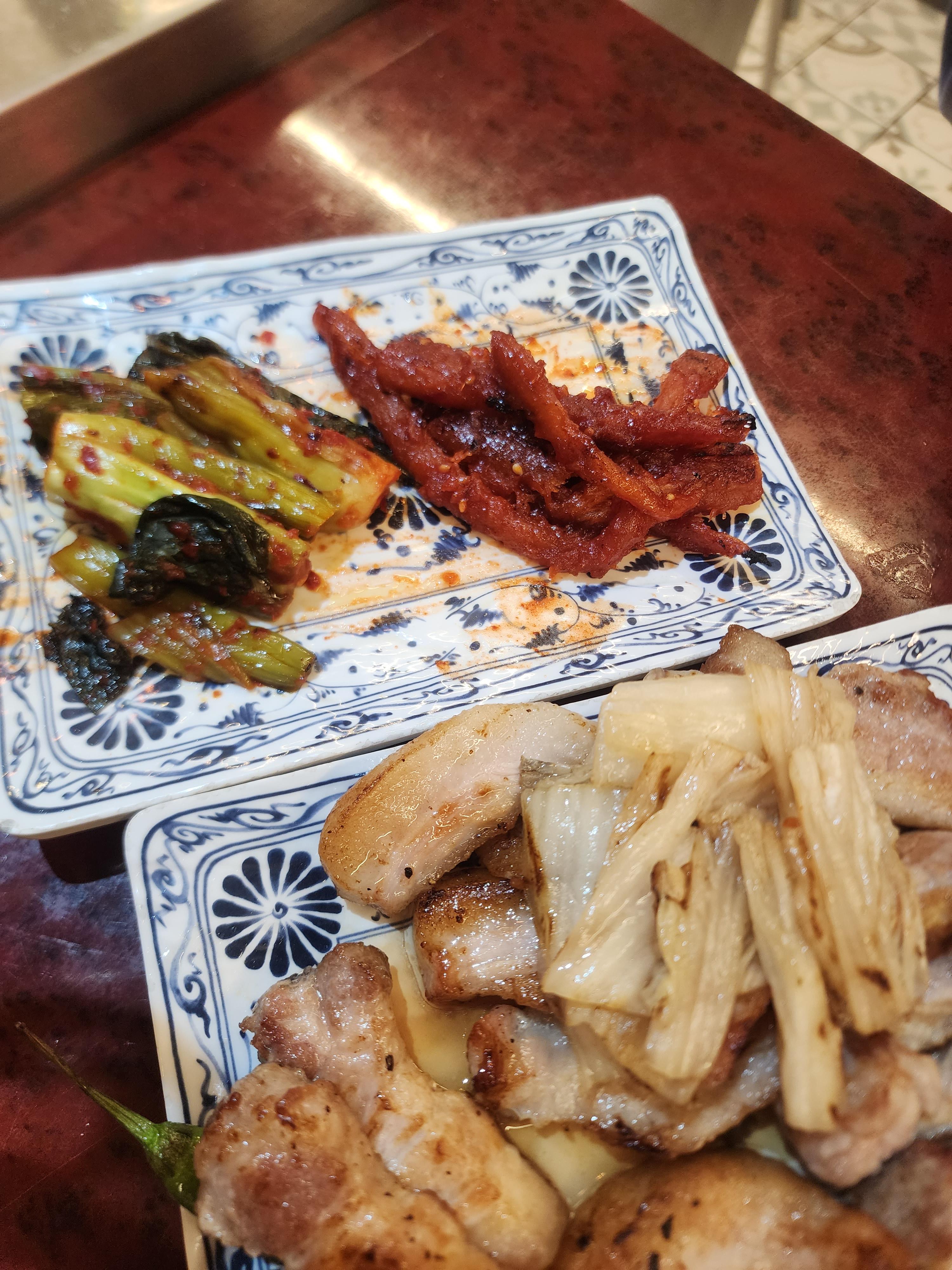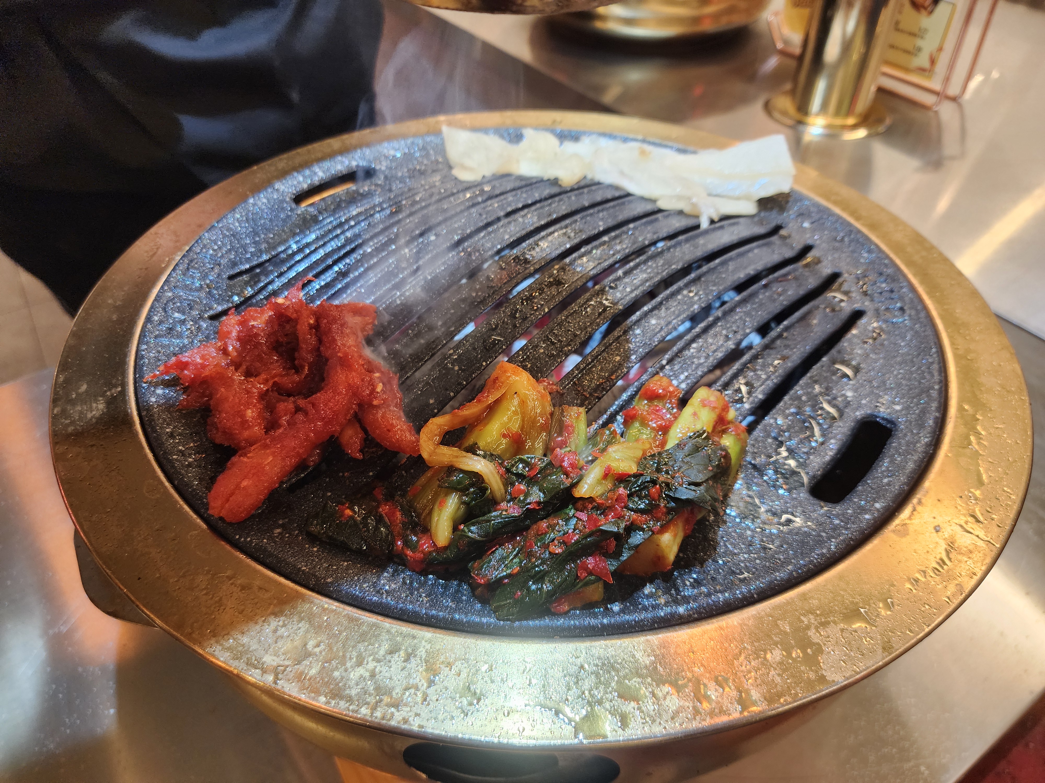 고기와 같이 먹을 수 있는 더덕과 갓김치, 씻은 묵은지를 구워주셨습니다.