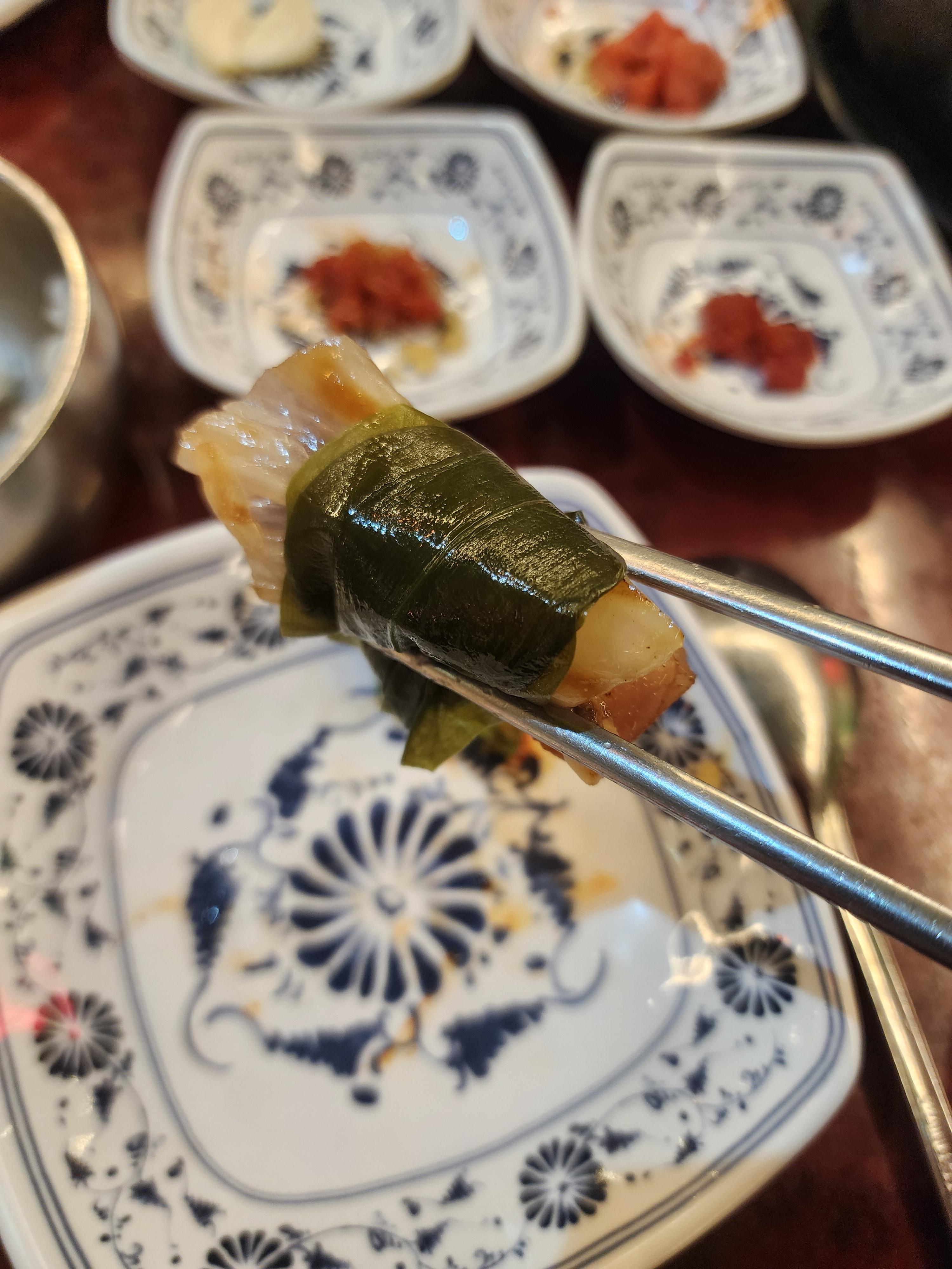 저는 구운 김치를 추가해서 삼합으로 먹었습니다.