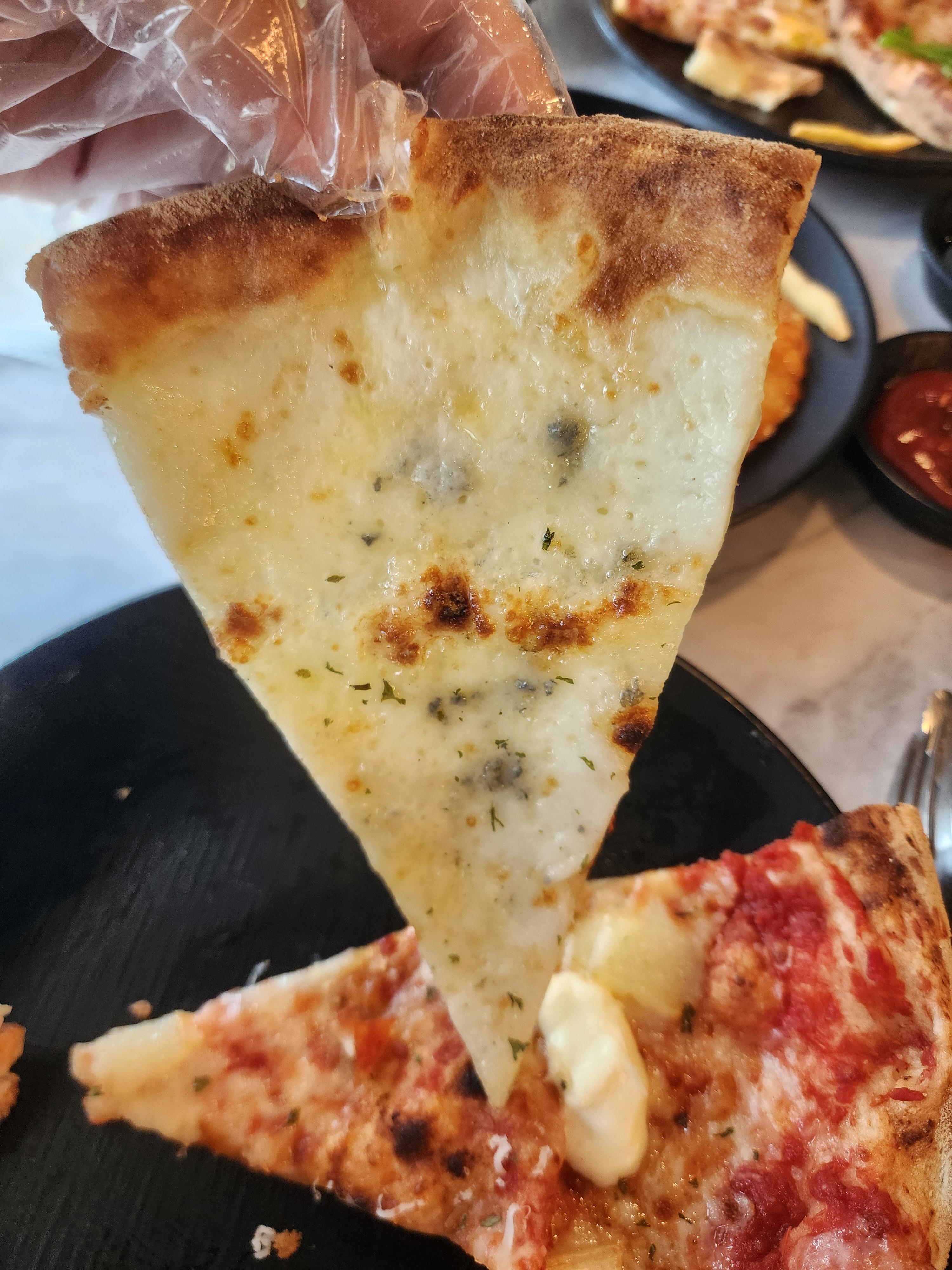 기껏 있는 거 먹었더니 갑자기 새로운 맛과 쭉쭉 늘어나는 치즈가 올라간 피자라니..