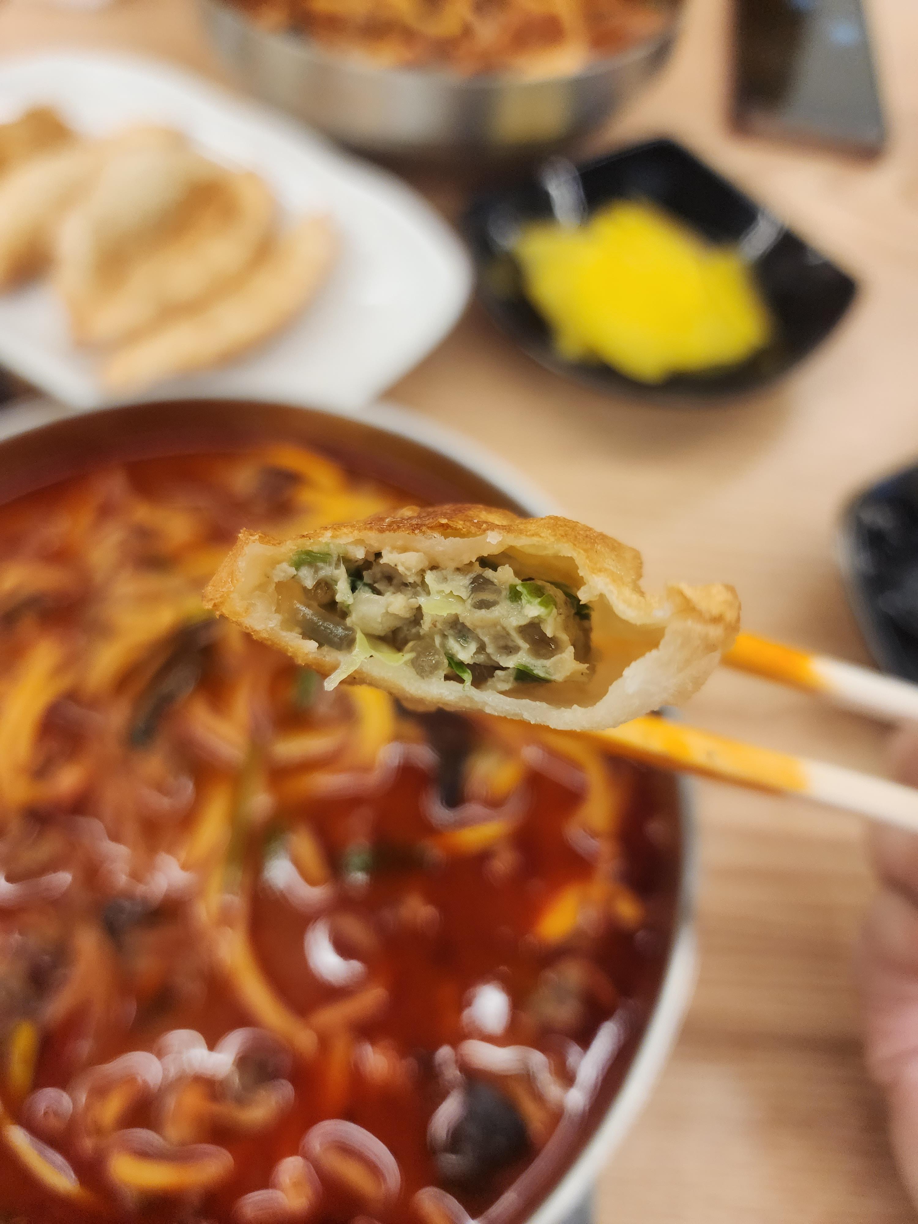 바로 만두 한 입을 먹었는데 바삭하고 뜨끈한 게 맛있네요!!