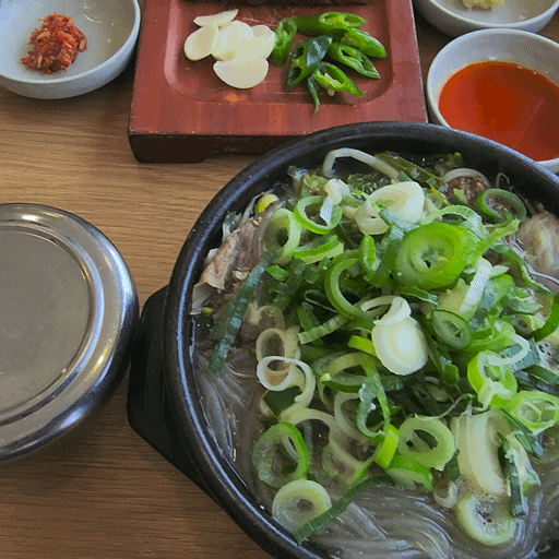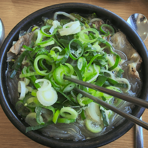 파가 산더미처럼 올라가 있고 당면과 고기도 많이 있습니다.