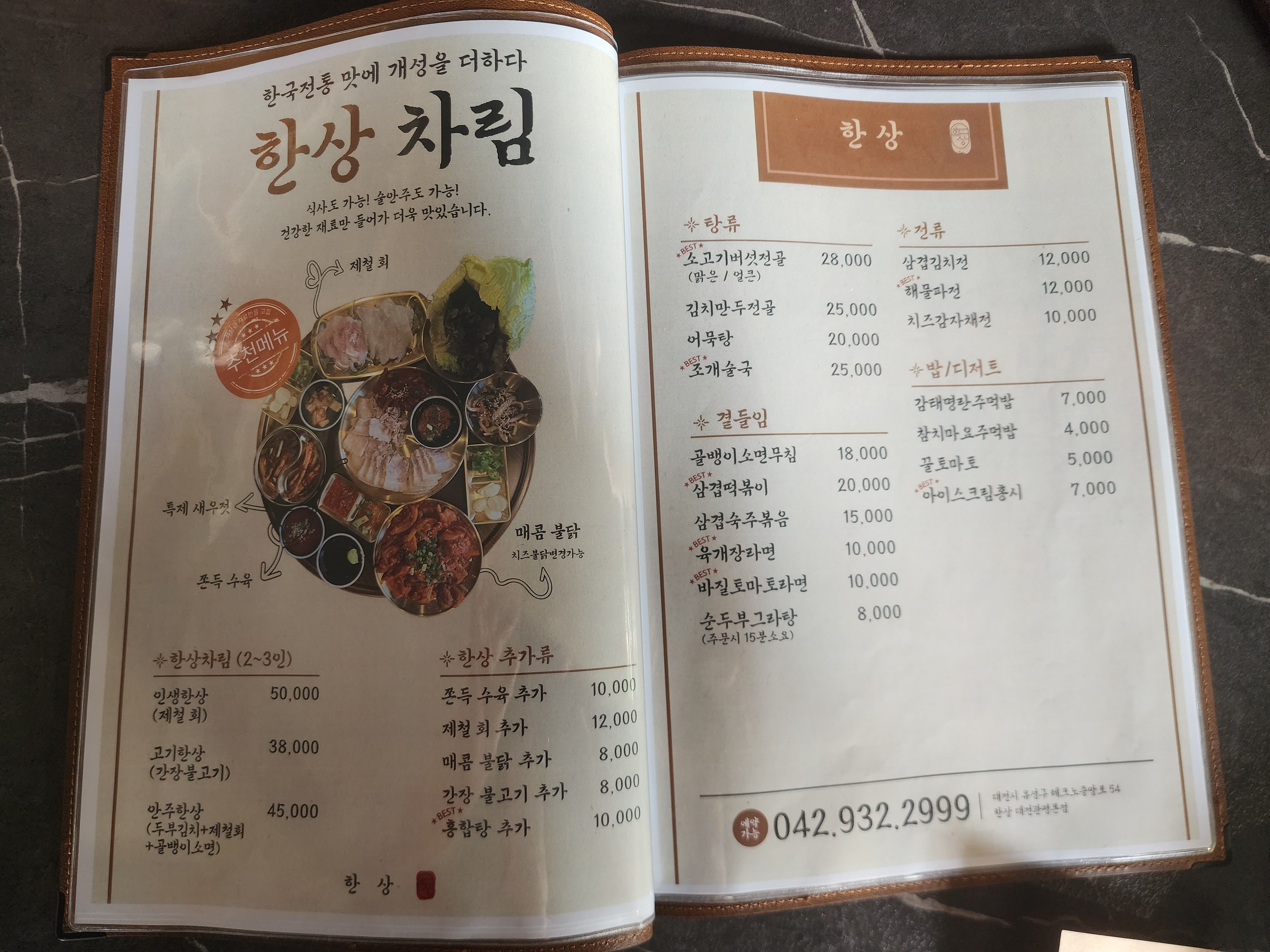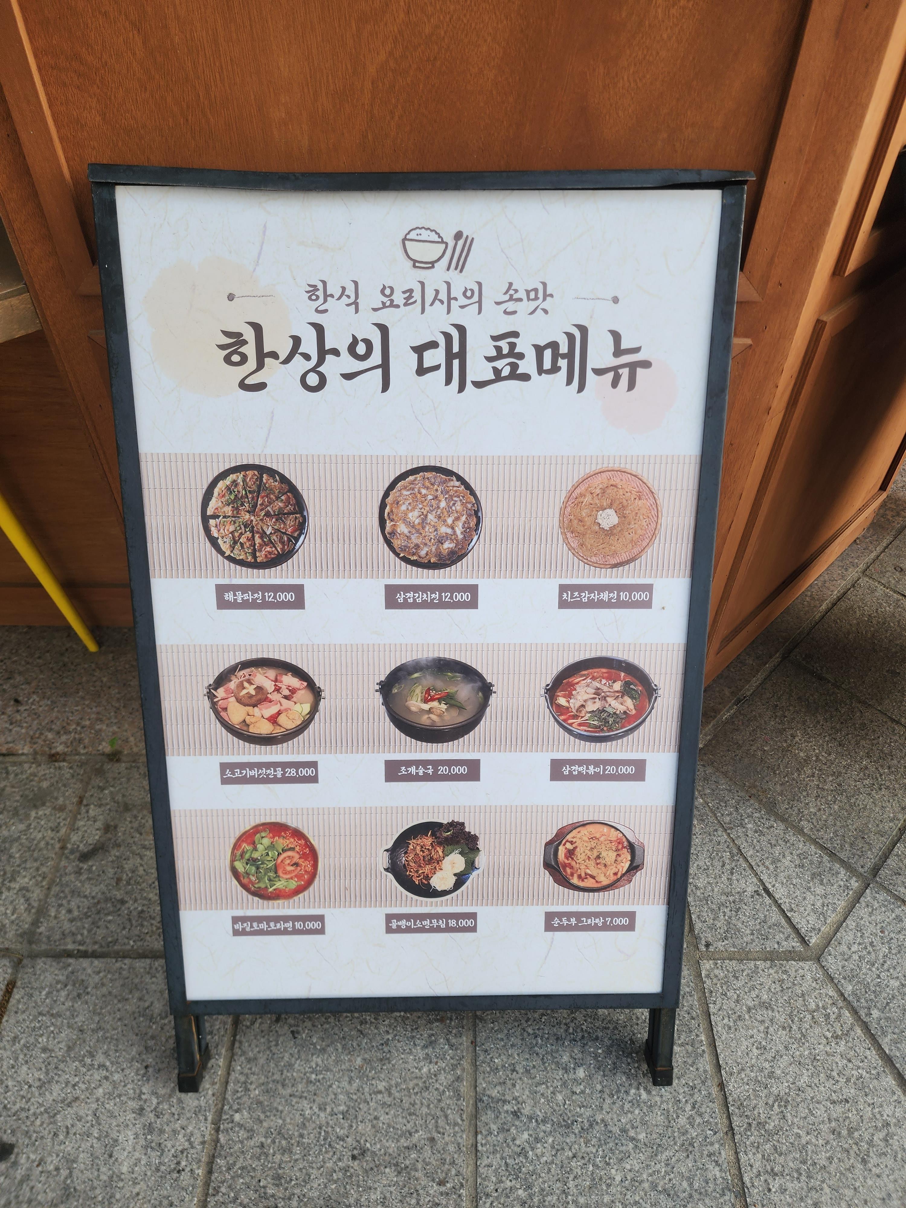한상 음식 메뉴 및 가격입니다.