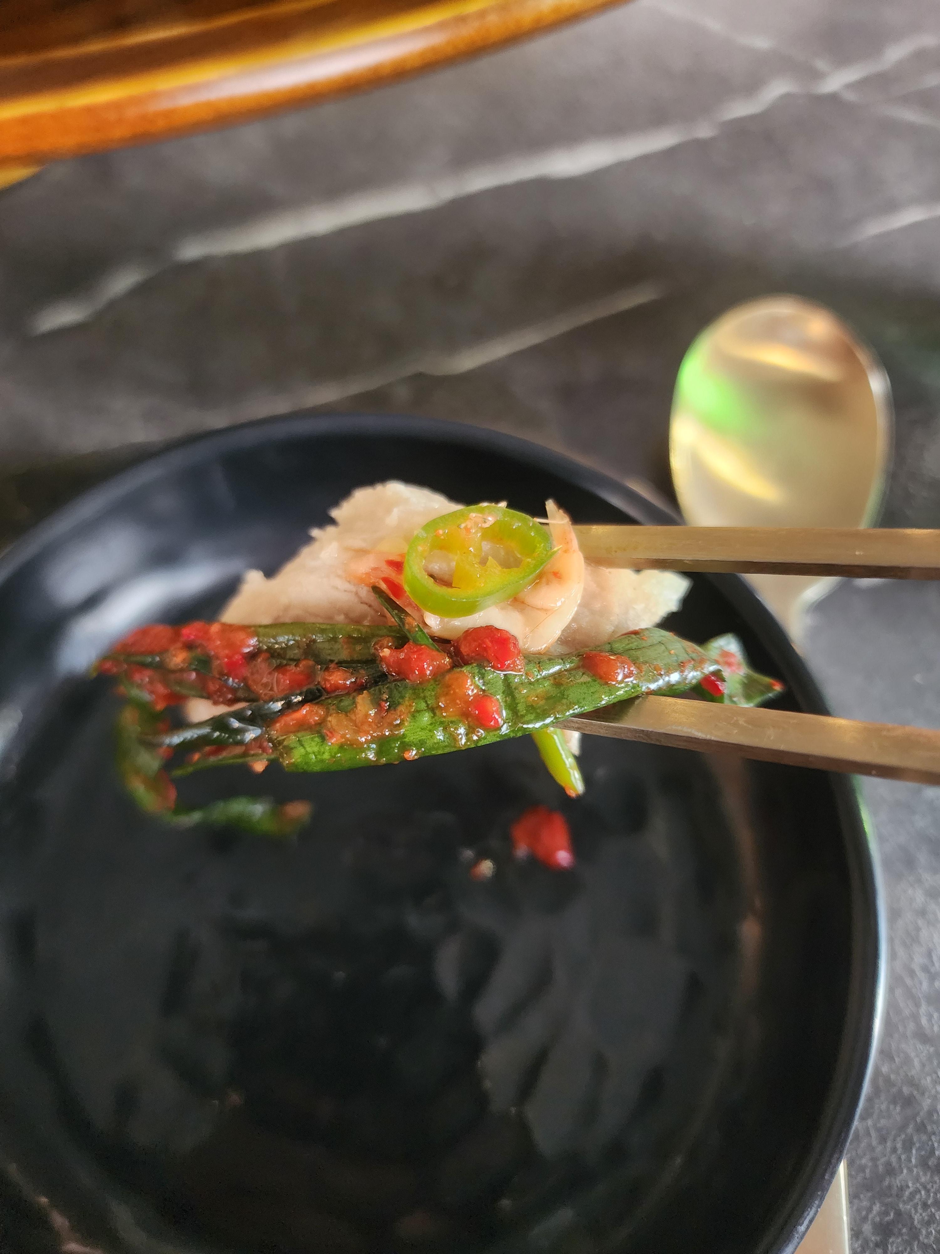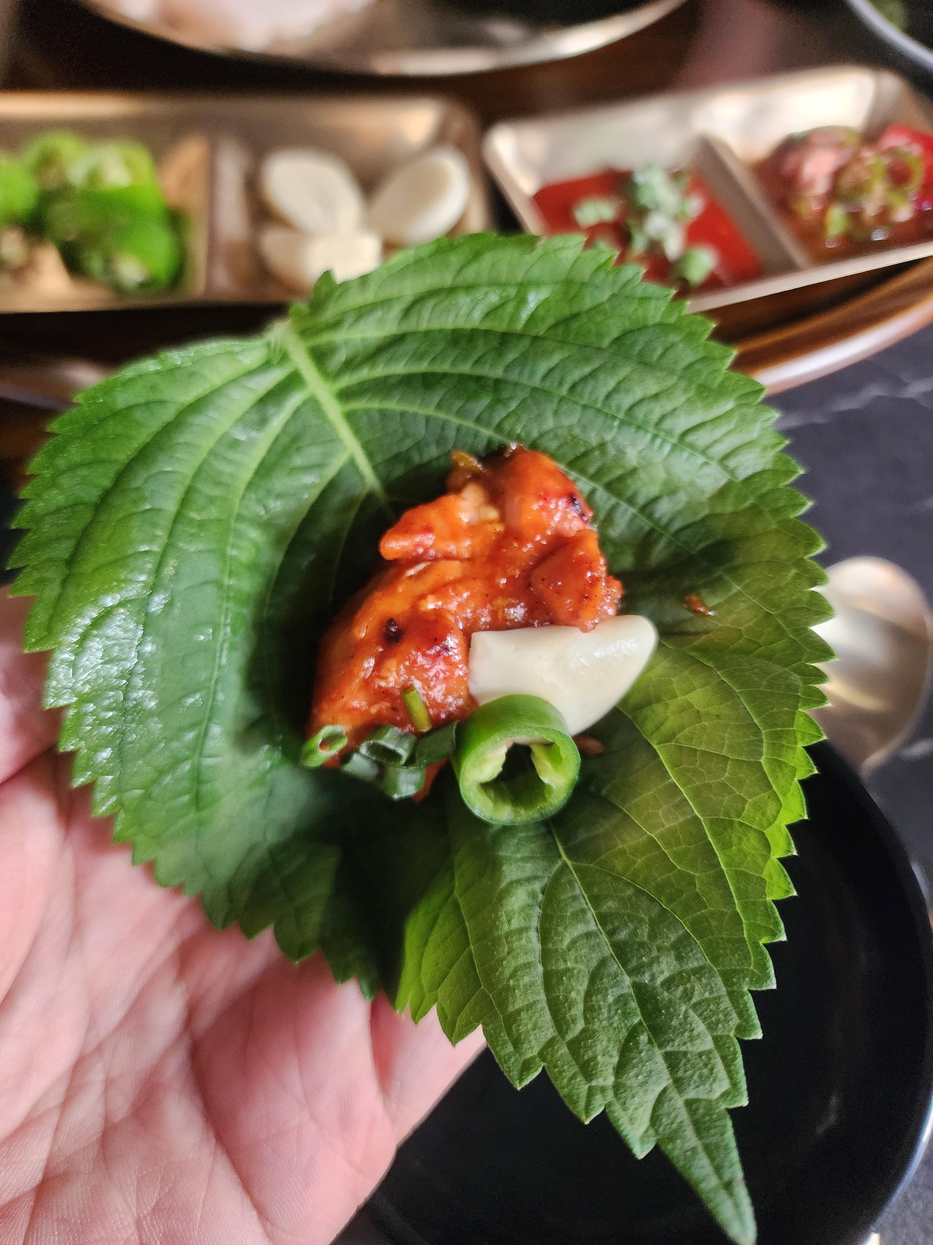 바로 깻잎에 싸서 먹었는데 적당히 매콤하고 고기도 부드러운 게 너무 맛있습니다.