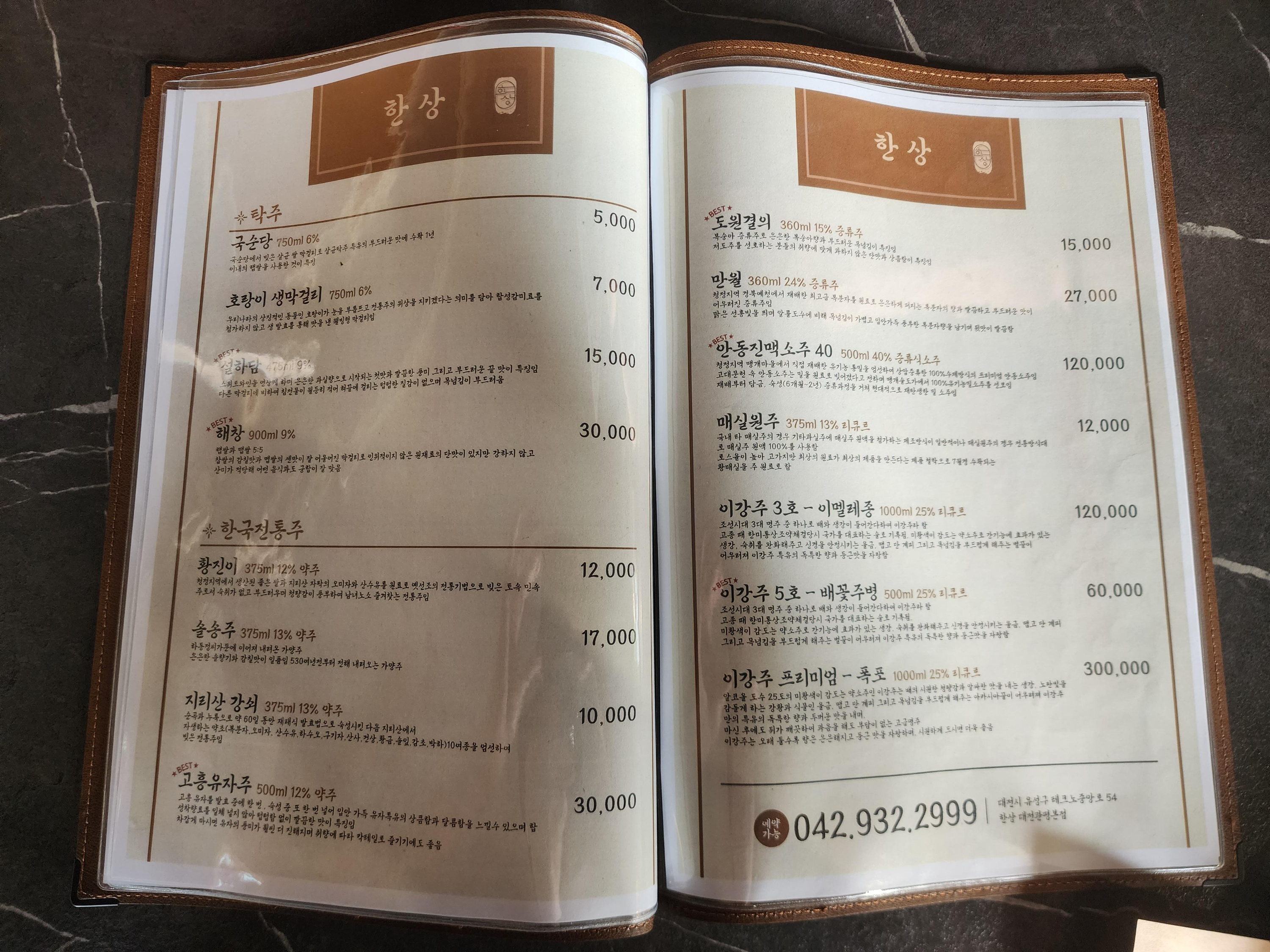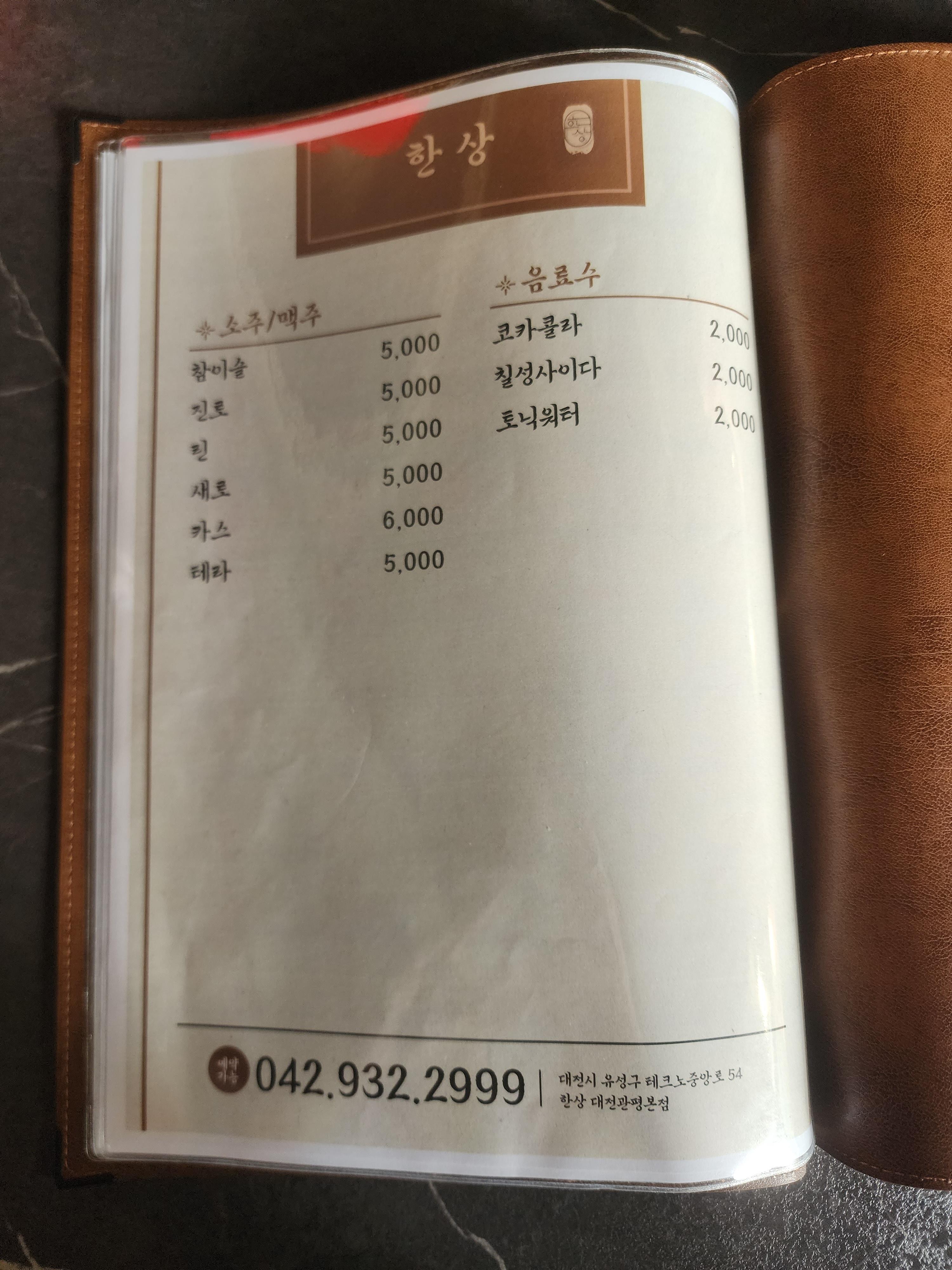 한상 주류, 음료 메뉴 및 가격입니다.