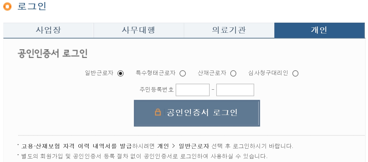 일반 근로자를 선택하고 공인인증서 로그인을 해주세요.
