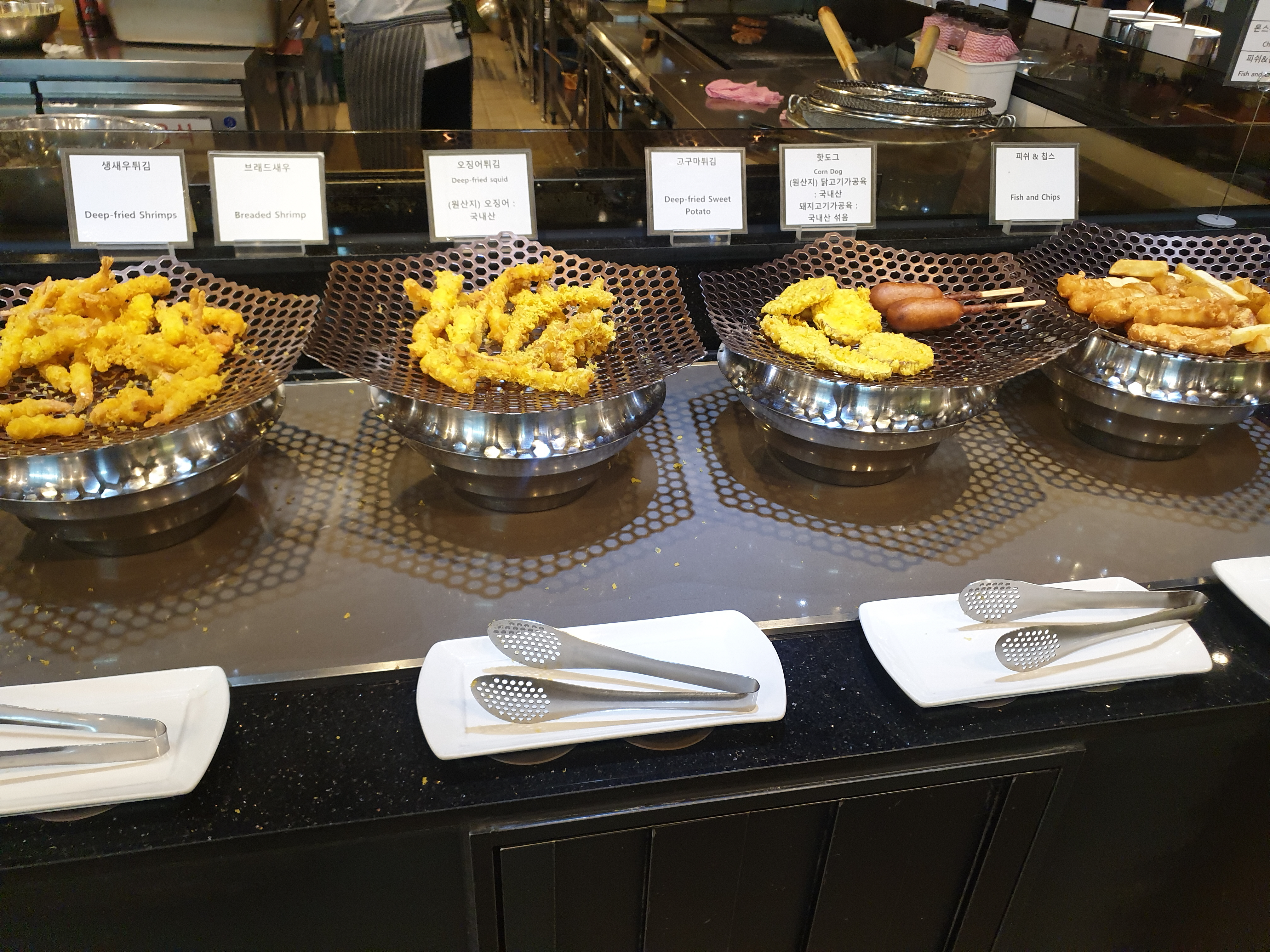 새우, 오징어, 고구마, 피시엔 칩스, 핫도그도 있어요.