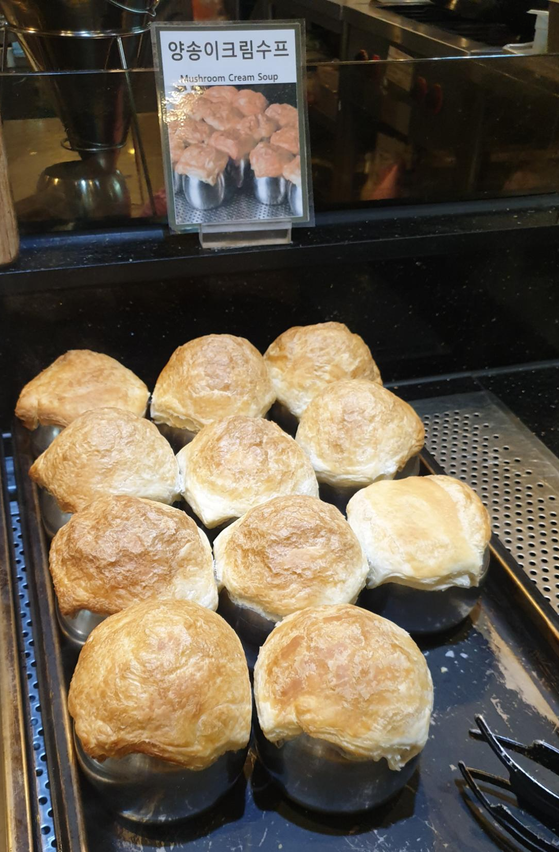 양송이 스프 위에 페스츄리가 올라가 있어 찍어먹으면 꿀 맛이에요.